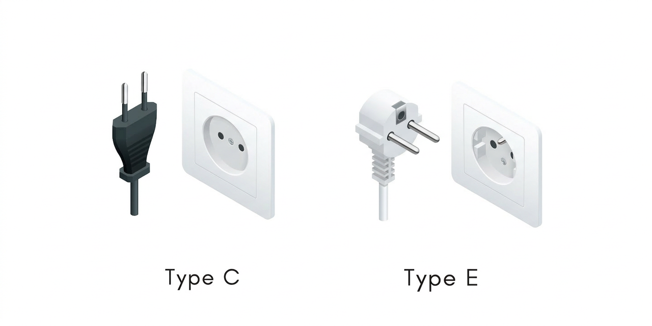 - Type E plugs have two round pins with a hole for the socket’s male earth pin.