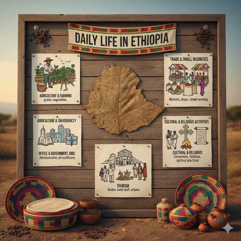 Ethiopia has a rich culture and a diverse economy, and daily life varies between cities and rural areas. Here’s what people commonly do in Ethiopia: