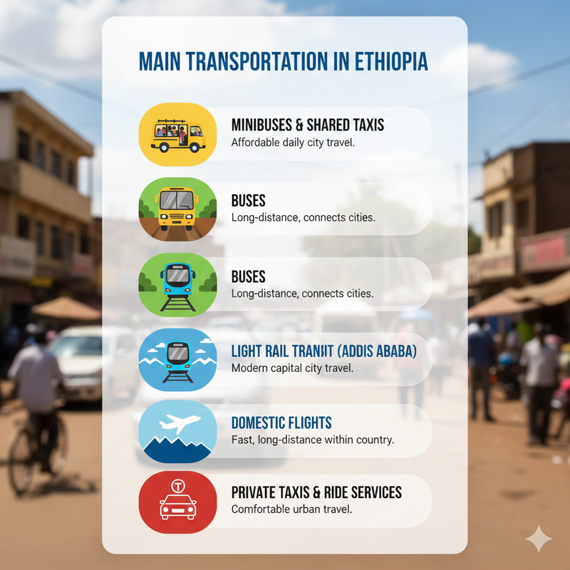 Ethiopia offers a mix of traditional and modern transportation options, making it easier for travelers to move within cities and across regions. The most common modes include: